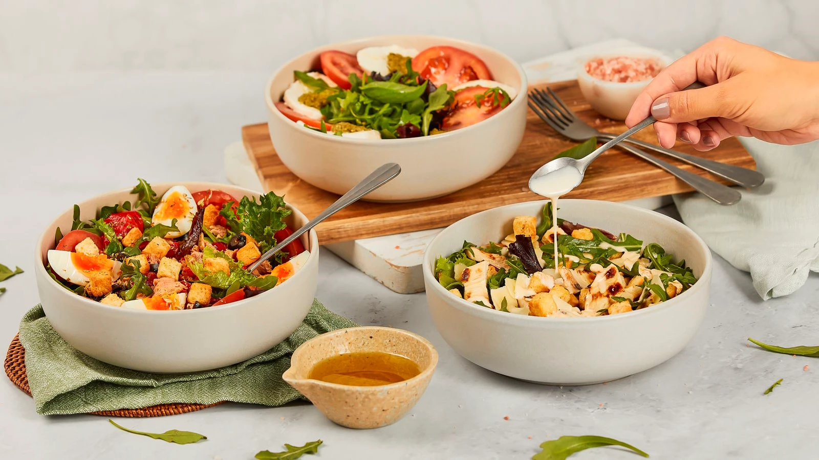 Alface, Rúcula, Tomate Cherry, Camarão, Abacate, Cebola Roxa, Couscous e Vinagre de Pesto