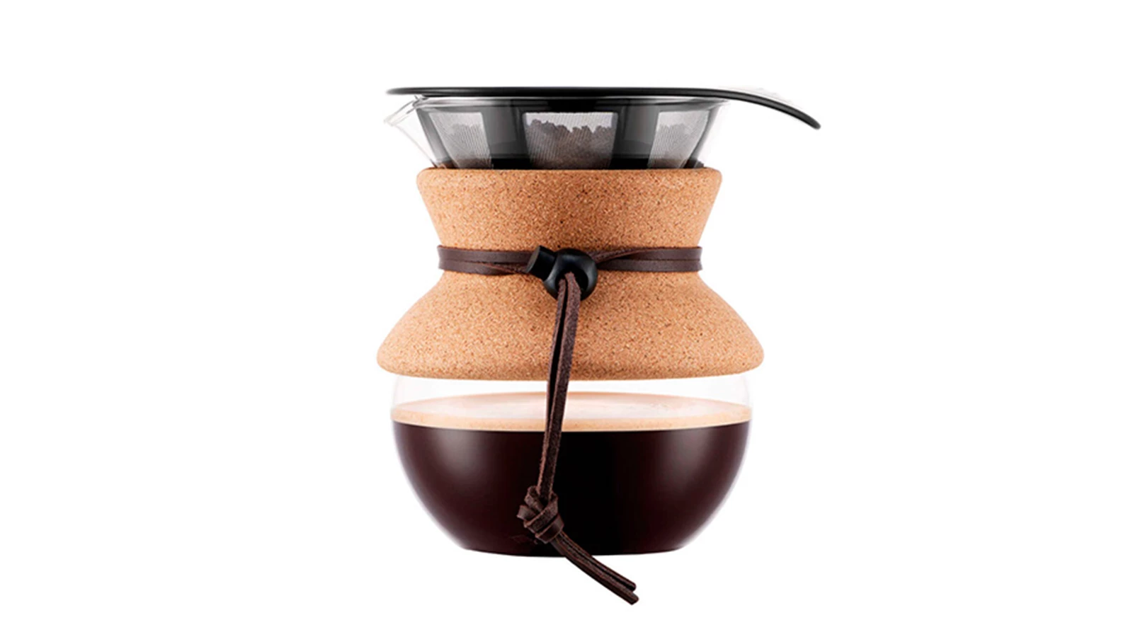 Já a cafeteira Pour Over com filtro permanente em aço inoxidável produz um café rico com um aroma robusto. Tem uma manga de cortiça para evitar queimaduras. Está disponível com capacidade de 1 litro e com manga de plástico.