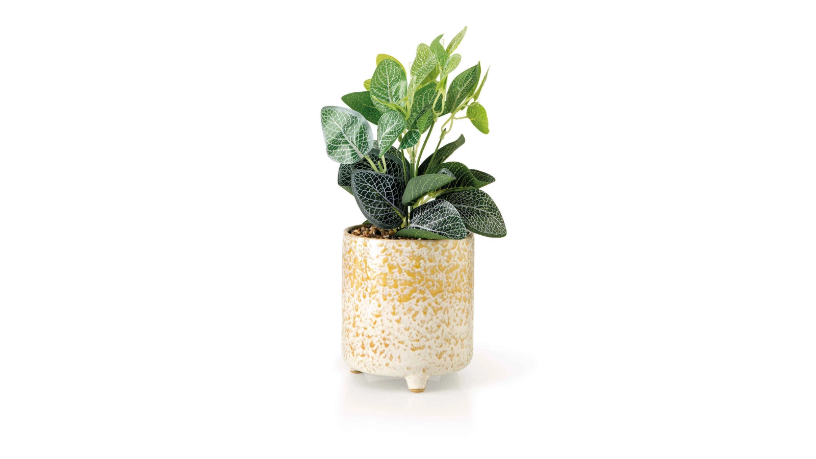 Pode distribuir algumas plantas mais pequenas numa prateleira em cima da cama, na mesinha de cabeceira ou ainda uma planta média num canto, junto à janela. Esta planta artificial com vaso em cerâmica da marca KASA pode ser uma ótima opção.