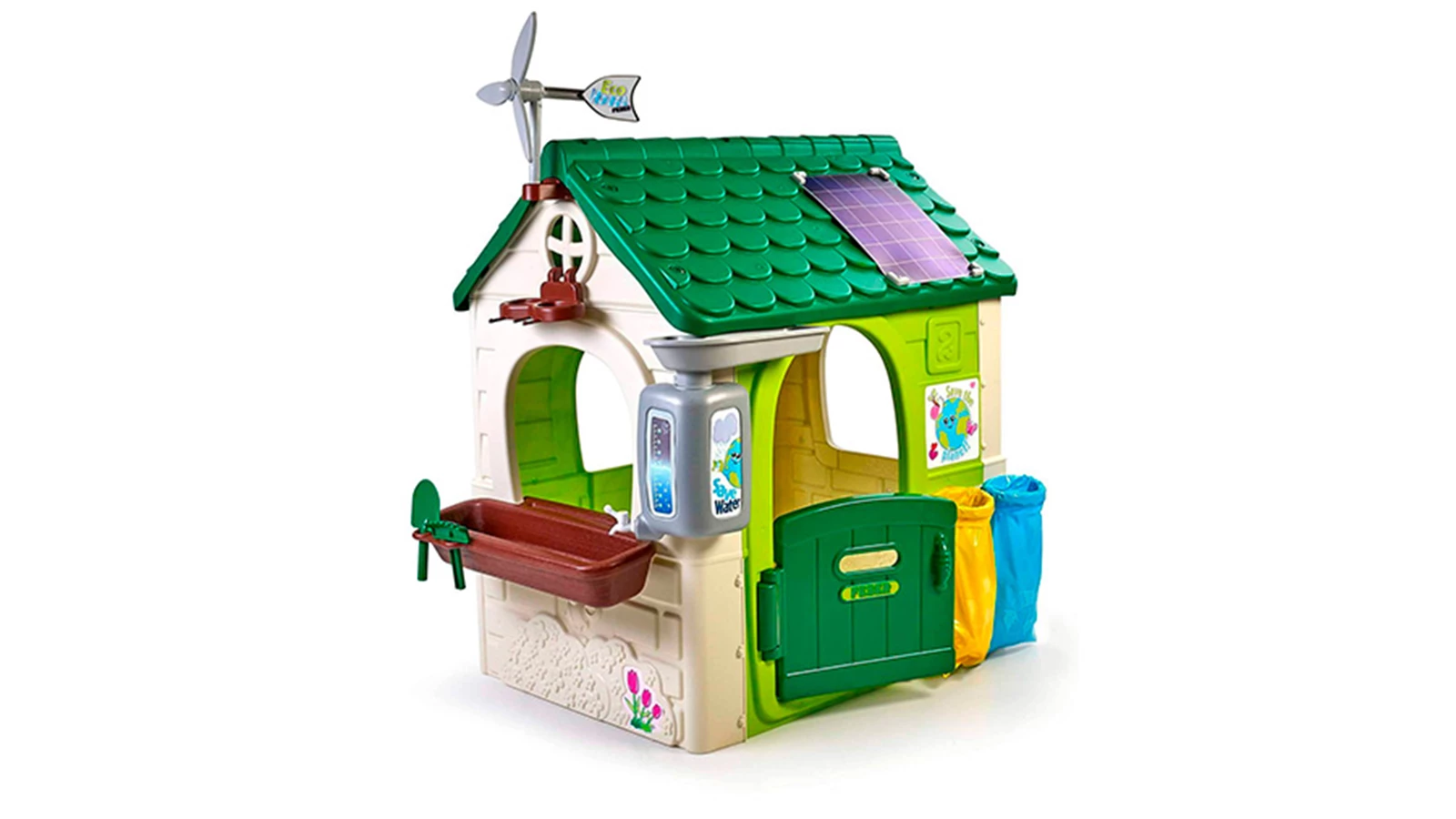 A casa de brincar Green House Feber está equipada com tudo o que os mais novos precisam para darem os primeiros passos no mundo da sustentabilidade. Há dois caixotes para reciclagem, ferramentas de jardinagem para criar pequenos jardins, e um sistema inteligente de reutilização da água da chuva. Vem ainda com uma mini ventoinha eólica e um painel solar de brincar. O brinquedo perfeito para as crianças se divertirem, aprenderem e cuidarem do planeta!