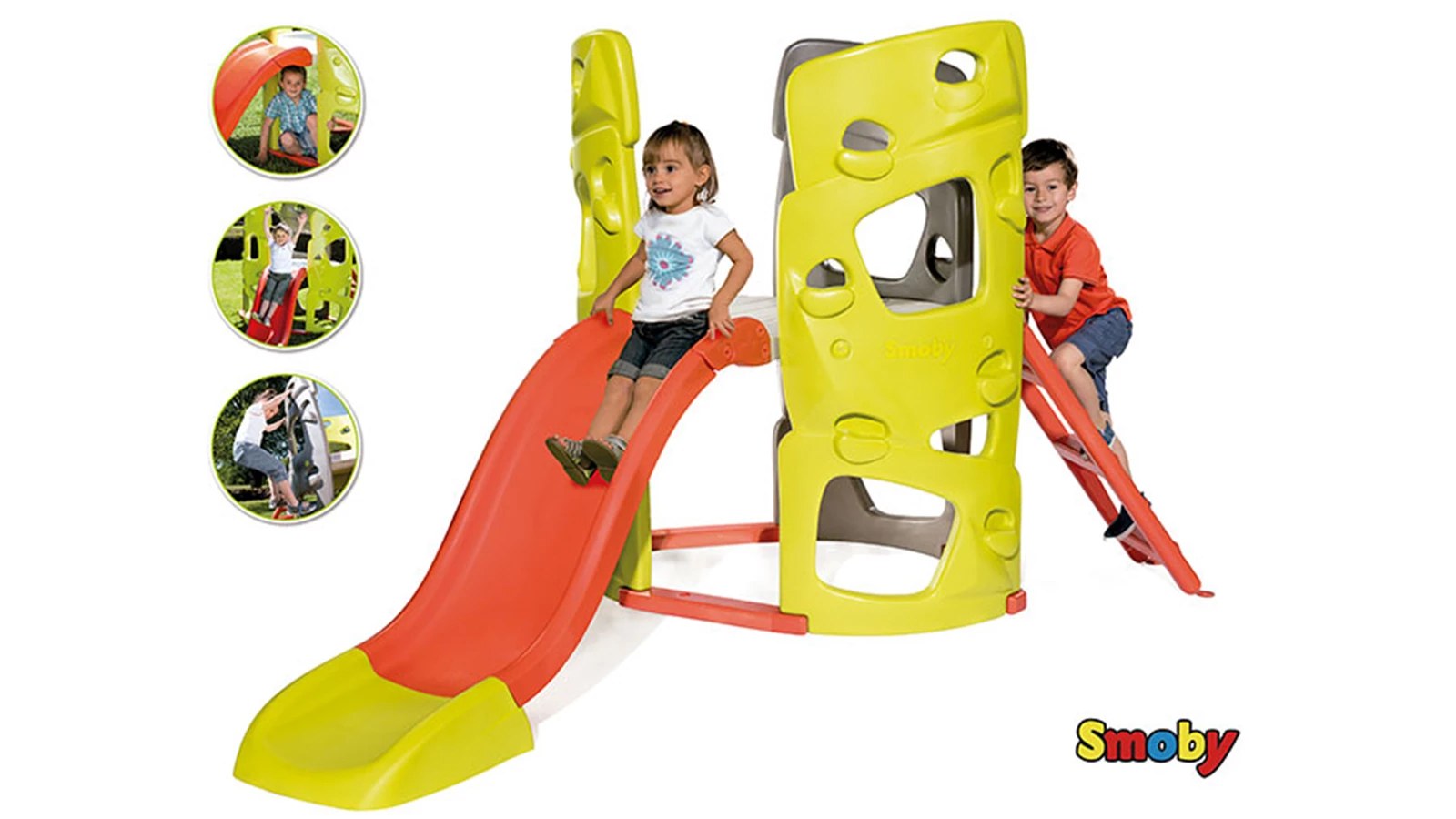 Esta torre multiatividades da Smoby vem equipada com duas áreas para manter os pequenos entretidos durante horas a fio: três paredes de escalada emocionantes e um escorrega de 1,5 metros para fazer subir a adrenalina. Suporta um peso máximo de 100 kg, para que as crianças possam brincar à vontade sem preocupações. E as cores do brinquedo vão permanecer vibrantes e intactas durante muito tempo, graças ao tratamento especial anti UV de todas as peças.