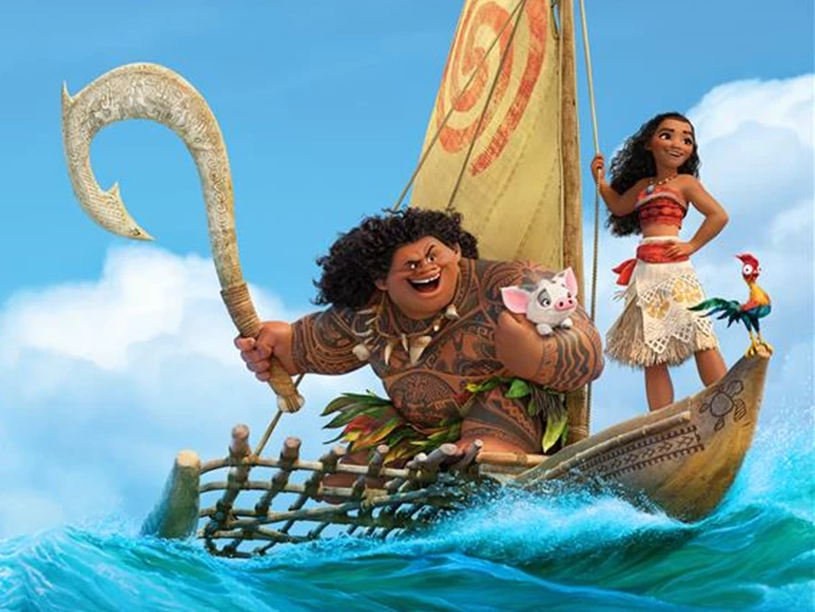 Vaiana e o semideus Maui partem numa viagem para atravessar o oceano.