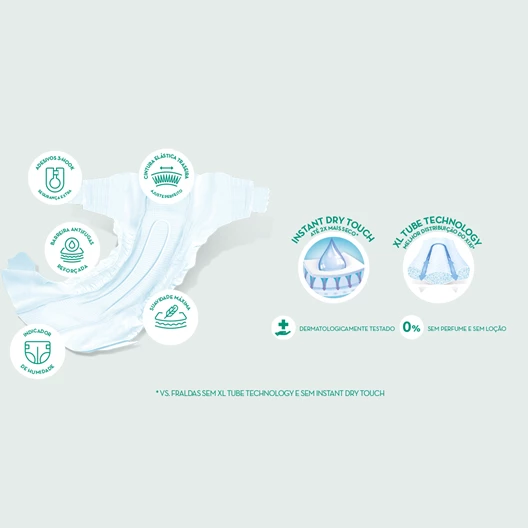 As tecnologias avançadas Instant Dry Touch e o sistema XL Tube proporcionam uma absorção rápida e eficaz, mantendo a pele do bebé seca durante a noite toda.