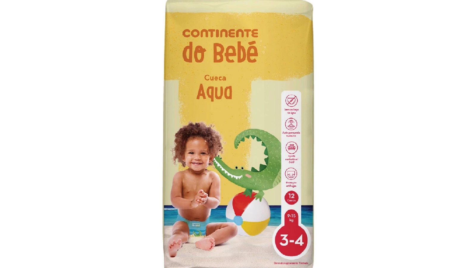 As Cuecas Aqua Continente do Bebé são ideais para os dias de praia e de piscina, uma vez que não incham na água, têm um ajuste confortável 360º e proteção antifugas. Estão disponíveis em dois tamanhos, para crianças entre os 9 e os 15kg e entre os 12 e 17kg. Dependendo do tempo que passar na praia, leve entre 2 a 4 fraldas de banho para ter de sobra quando for preciso trocar. Lembre-se também de levar fraldas normais para quando tiver de vestir o bebé para ir embora, ou mesmo para dormir a sesta.