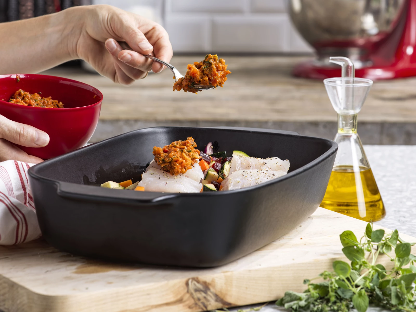Tal como a travessa média, esta travessa pode ser usada no forno até 260ºC e no micro-ondas e guardada no frigorífico. É compatível com utensílios de madeira e silicone, para proteger o grés, e é lavável na máquina de lavar loiça. - Tampa grande