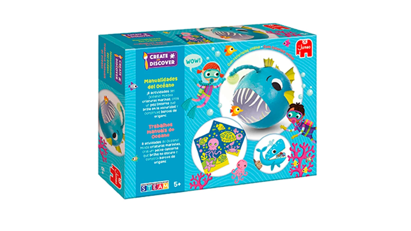 Um jogo científico que favorece a aprendizagem STEAM. Create & Discover - Oceano inclui diferentes experiências que ajudarão as crianças a aprender mais sobre o oceano. Aqui, vão descobrir como criar criaturas do fundo do mar, modelar um peixe de combate, fazer flutuar barcos de origami e muito mais!