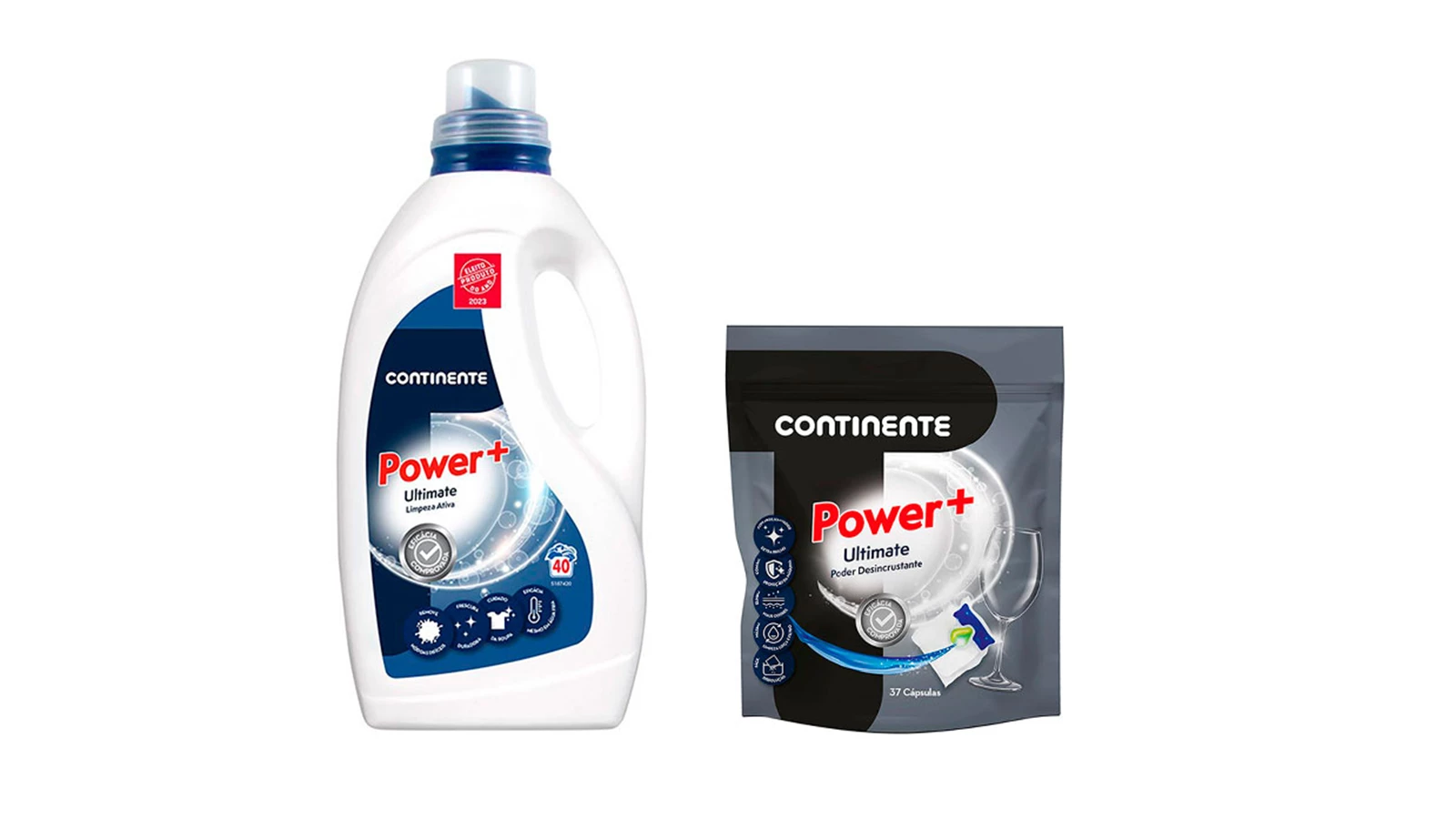 Dentro da gama de detergentes Power+ da marca Continente, destacaram-se dois produtos nesta edição dos “Produtos do Ano”: as pastilhas para a loiça Ultimate e o detergente líquido para a roupa.