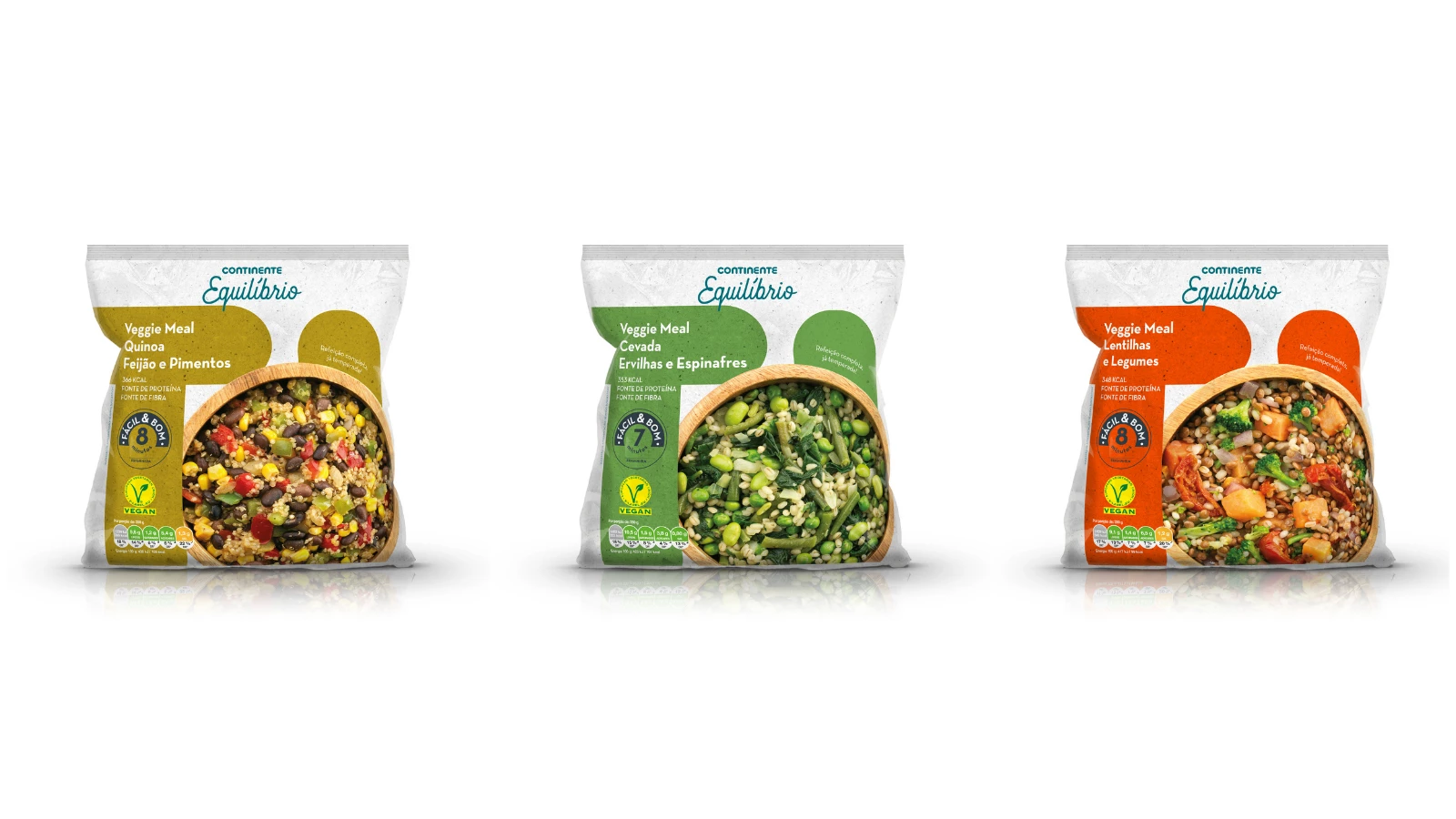 As refeições vegetarianas Veggie Meal estão disponíveis no Continente Online e nas lojas físicas, em 3 combinações de sabores: lentilhas e legumes, quinoa, feijão e pimentos e cevada, ervilhas e espinafres.