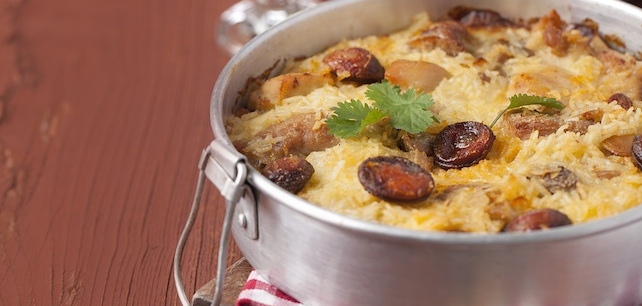 Numa assadeira, espalhe o preparado feito com as carnes (reservando algumas rodelas de chouriço). Por cima disponha o arroz e mexa com uma colher de pau, de forma a ficar tudo bem distribuído.