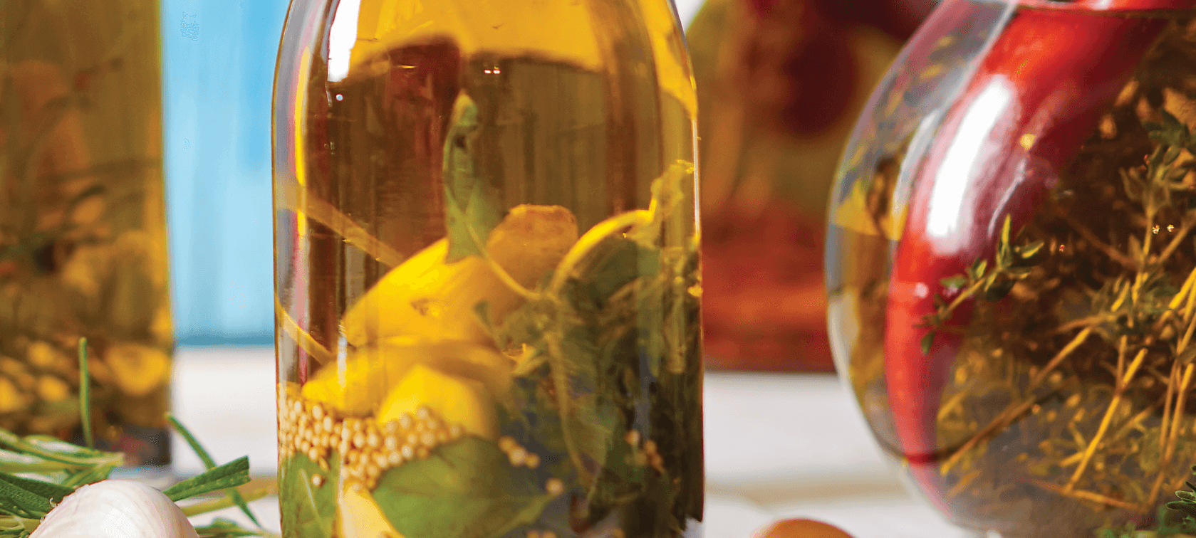 Num frasco, coloque 200 ml de azeite, os dentes de alho, a mostarda em grão e orégãos a gosto.