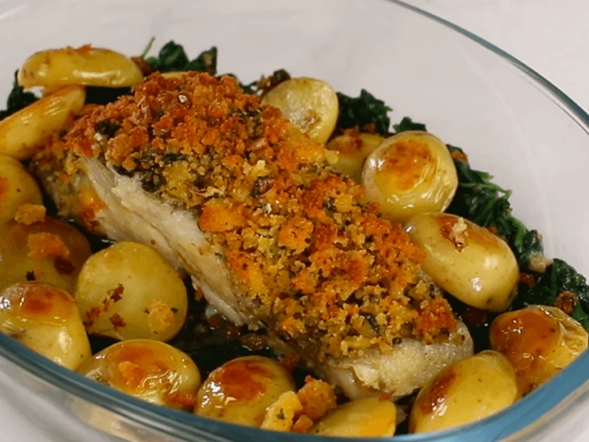 Cubra o fundo de um pyrex oval com os espinafres. Coloque no centro a posta de bacalhau, cubra com as migas e coloque as batatinhas à volta. Tempere com sal e regue com 1 fio de azeite. Leve ao forno durante 30 a 40 minutos, até as batatas estarem assadas.