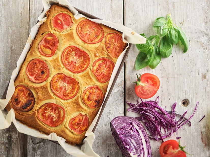 Unte um tabuleiro de forno com azeite e distribua o preparado pelo mesmo, colocando no topo as fatias de tomate.