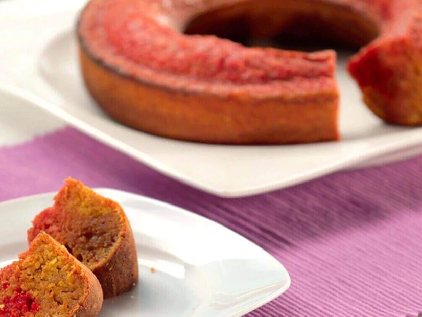 Misturar no liquidificador os ovos com o açúcar, acrescentar a beterraba, o óleo e o fermento. De seguida introduzir a farinha e envolver na massa.