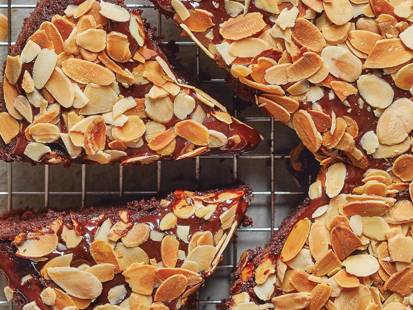 Quando o bolo estiver pronto, regue-o com a calda e polvilhe-o com as amêndoas laminadas.