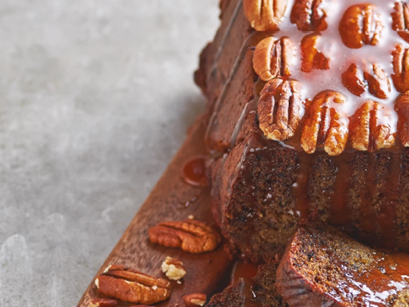 Sirva o bolo com esta calda e decorado com nozes-pecãs.