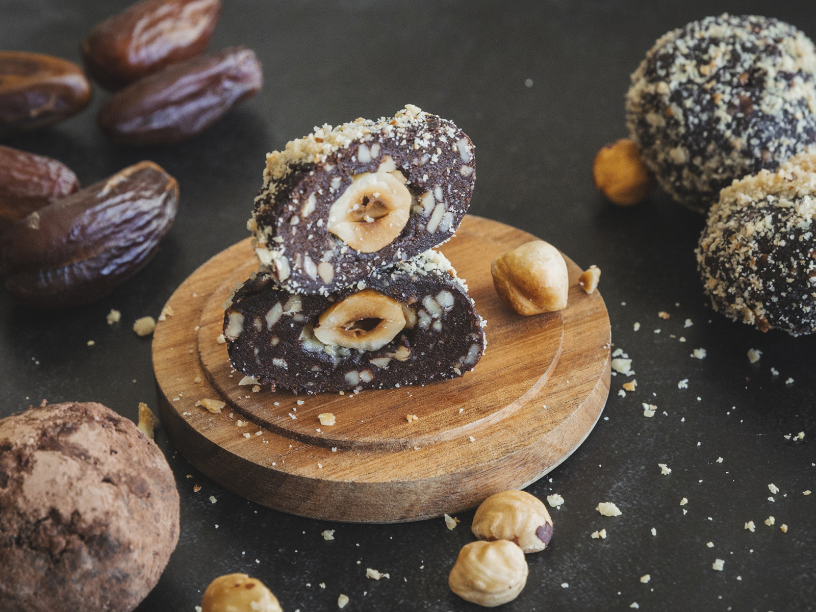 Coloque as avelãs tostadas num processador de alimentos e triture bem até obter uma consistência oleaginosa. Adicione o açúcar em pó, o oleo de coco derretido e o cacau magro em pó. Triture novamente bem. Reserve este creme de avela e chocolate.