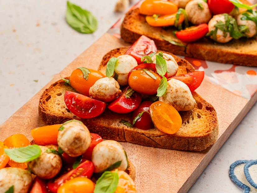 Esta bruschetta de tomate-cereja, mozzarela e manjericão é uma entrada fresca e irresistível, perfeita para saborear a qualquer hora com um toque mediterrânico.