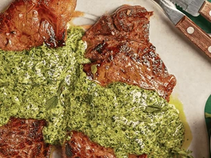 Num tabuleiro de forno coloque o cachaço e tempere com a cebola e o alho picados, metade do azeite, a banha, sal, o colorau, tabasco, o espumante, a salsa, o louro e a água e deixe marinar cerca de 12 horas.