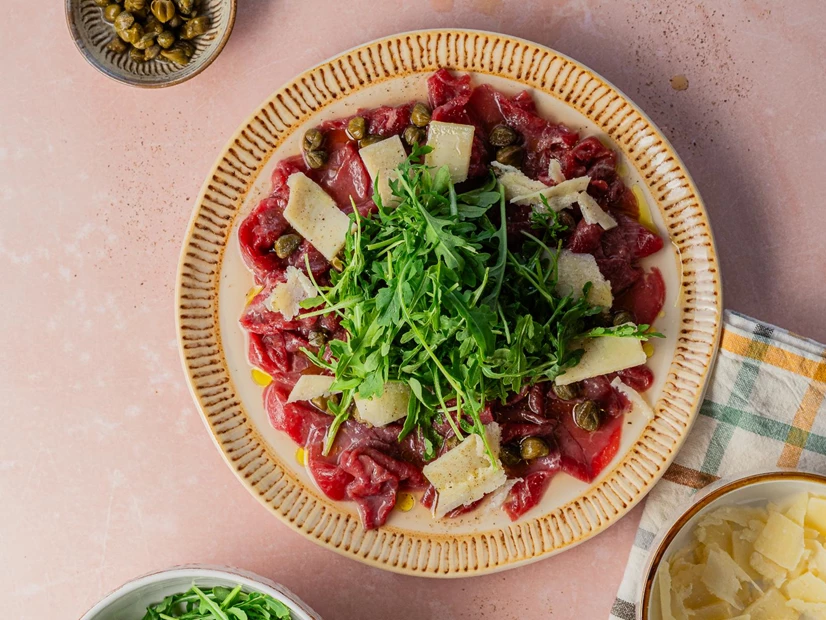 O carpaccio de vaca é uma entrada elegante e leve, feita com finíssimas fatias de carne de vaca crua, temperadas com ingredientes que realçam o sabor natural da carne.