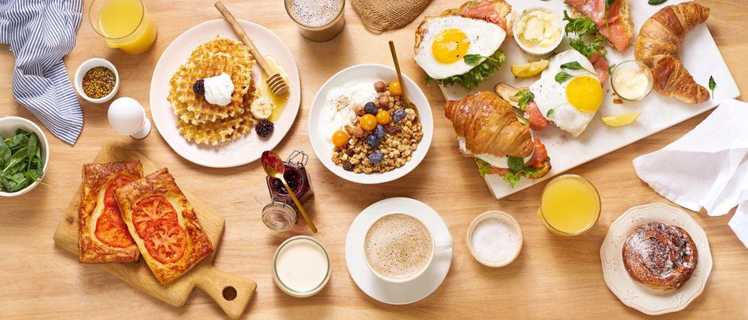 No que diz respeito aos tradicionais pratos associados ao pequeno-almoço, incluem-se os ovos mexidos, escalfados ou os ovos benedict, bolos, smoothie bowls, waffles, panquecas de chocolate, crepes, tostas de bacon com ovo estrelado ou tostas de abacate e croissants, como O Nosso Croissant, que pode juntar com os mais variados recheios disponíveis, por exemplo.