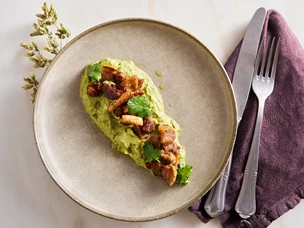 Temperar as costeletas de vitela com sal grosso dos dois lados, mariná-las no chimichurri e colocar a carne na grelha. Entretanto, esmagar as batatas (já cozidas) e colocá-las na grelha, quando estiverem douradas pincelar com um pouco da marinada de chimichurri.