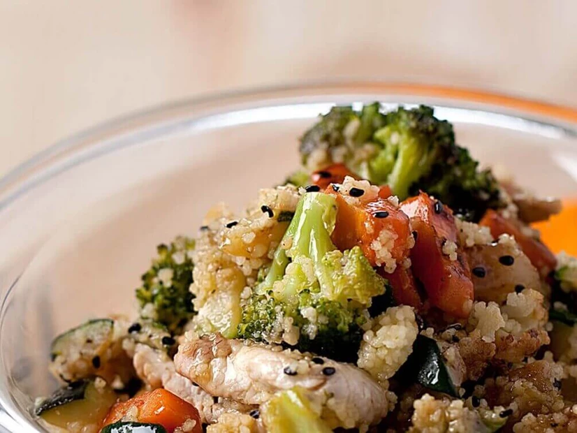 Aqueça o caldo de legumes sem ferver. Coloque o cuscuz num pyrex e cubra como caldo quente. Deixe o cuscuz absorver bem o líquido e separe-o com um garfo.