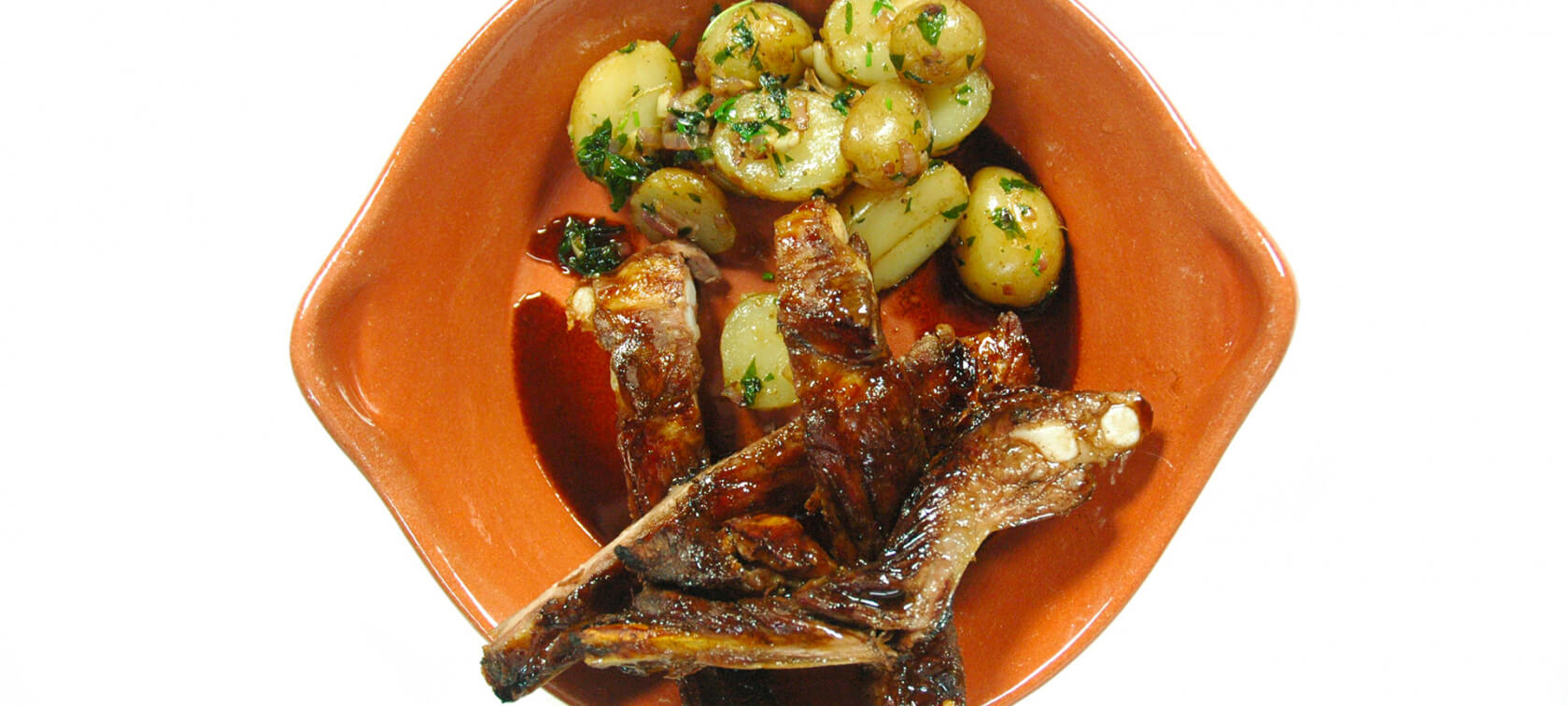 Sirva o entrecosto em pedaços e coloque numa travessa regado com o molho do assado e acompanhado das batatas.