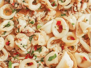 Escorra os legumes e transfira-os para um recipiente. Junte as azeitonas e metade do vinagrete.