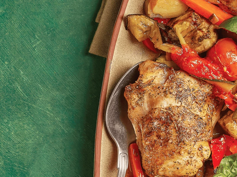 Coloque os legumes à volta do frango e leve ao forno pré-aquecido a 180ºC por cerca de 30 minutos.