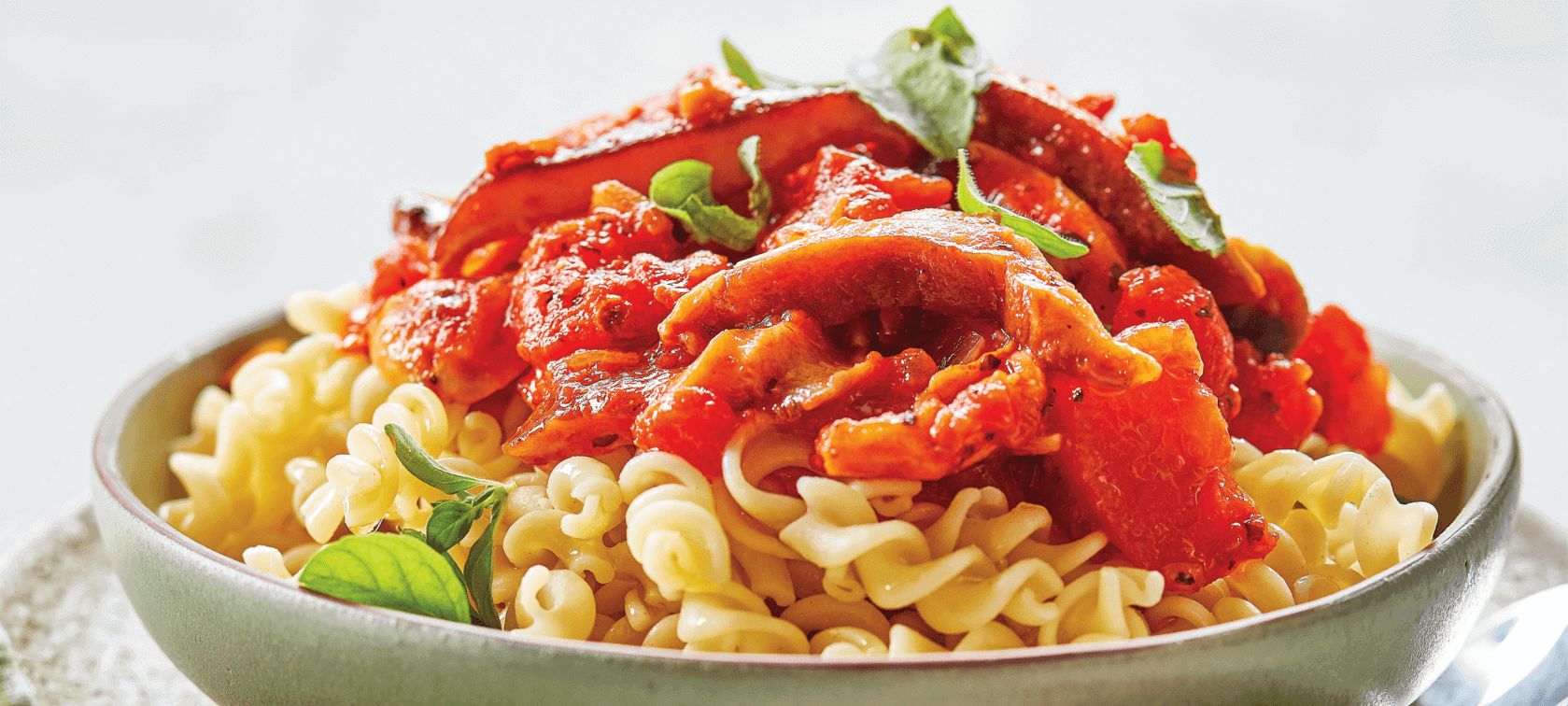 De seguida, junte o pimento em cubos e os cogumelos laminados e deixe saltear por alguns minutos.