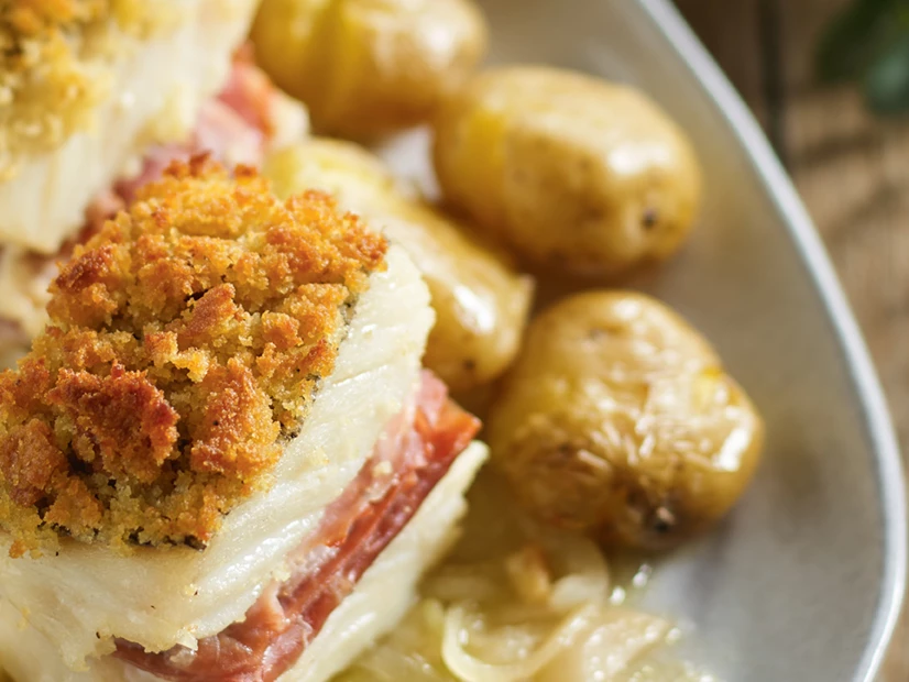 Num robô de cozinha, triture a broa com um fio de azeite e cubra os lombos com a mesma, pressionando para criar uma capa compacta.À volta do bacalhau, disponha as batatinhas com a casca.