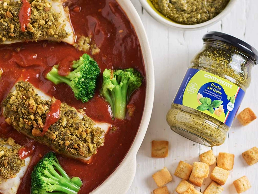Coloque o molho de tomate num tabuleiro e adicione os medalhões com a crosta de pesto virada para cima.