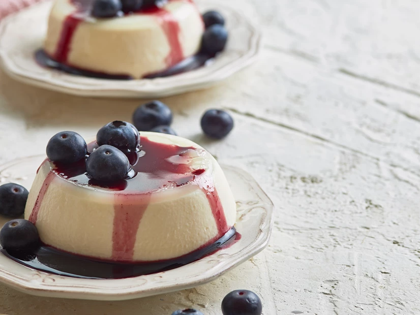 Junte mirtilos e verta por cima da panna cotta desenformada.