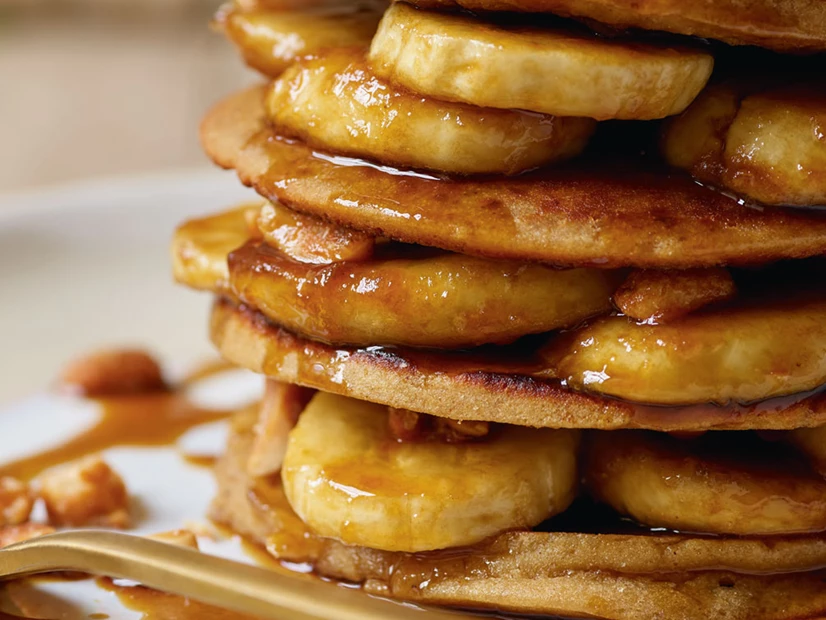 Monte as panquecas alternando-as com as rodelas de banana, o caramelo e os amendoins.
