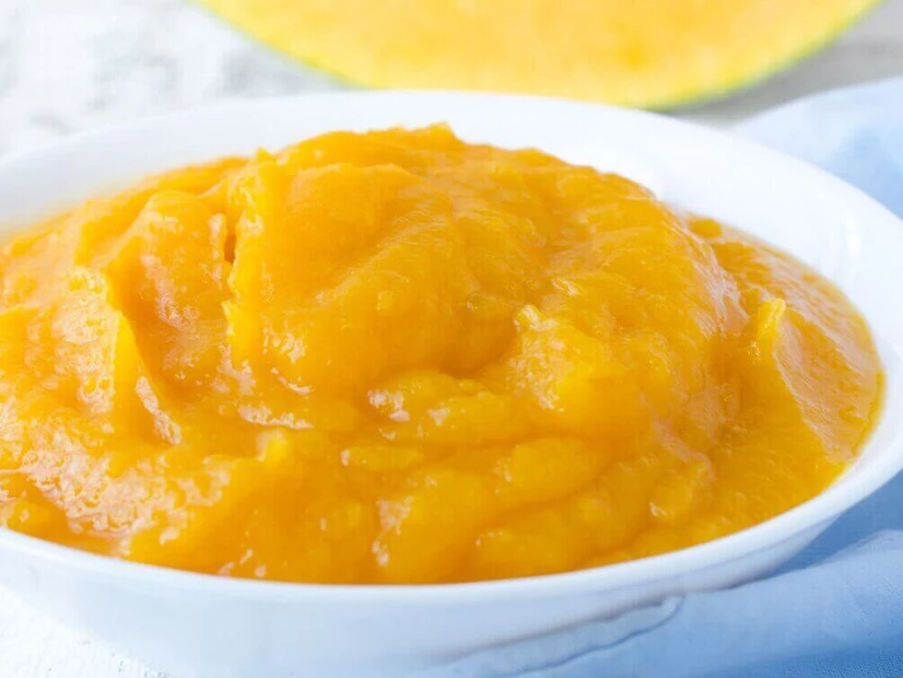 Descasque a fruta e triture, formando um puré. Sirva à sobremesa ou ao lanche.