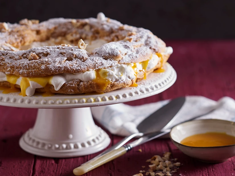 O Paris-Brest com puré de dióspiro e amêndoa é uma sobremesa elegante e cheia de sabor, que reinventa o clássico francês com um toque de frutas e frutos secos.