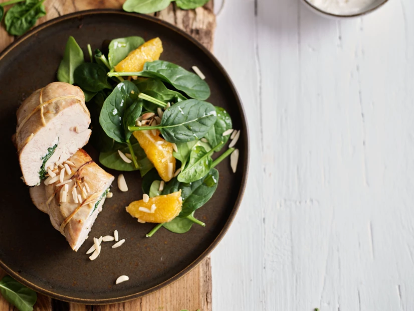 Num dos lados, coloque o queijo ricota, tempere com pimenta, junte folhas de espinafres e feche-os novamente, atando-os com fio de cozinha.