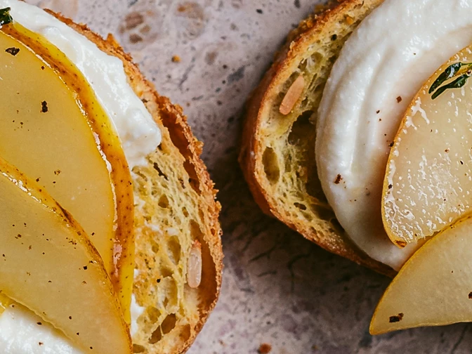 Barre as fatias de pão torrado com a mistura de ricotta, disponha as peras caramelizadas por cima e decore com tomilho e pimenta a gosto.