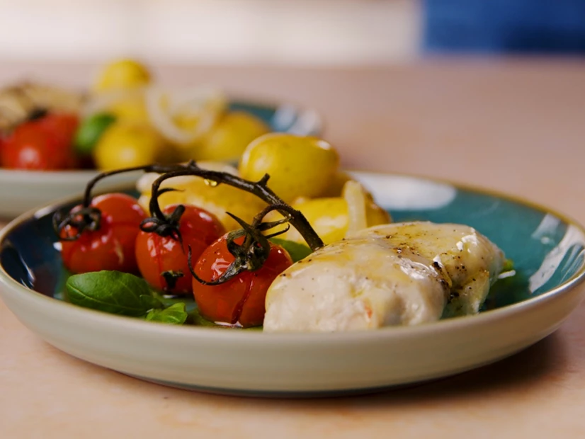 Colocar num tabuleiro ou assadeira as batatinhas, cebola cortada em meias luas, os alhos esmagados, os tomates, um dos limões cortado às rodelas e folhas de manjericão a gosto.