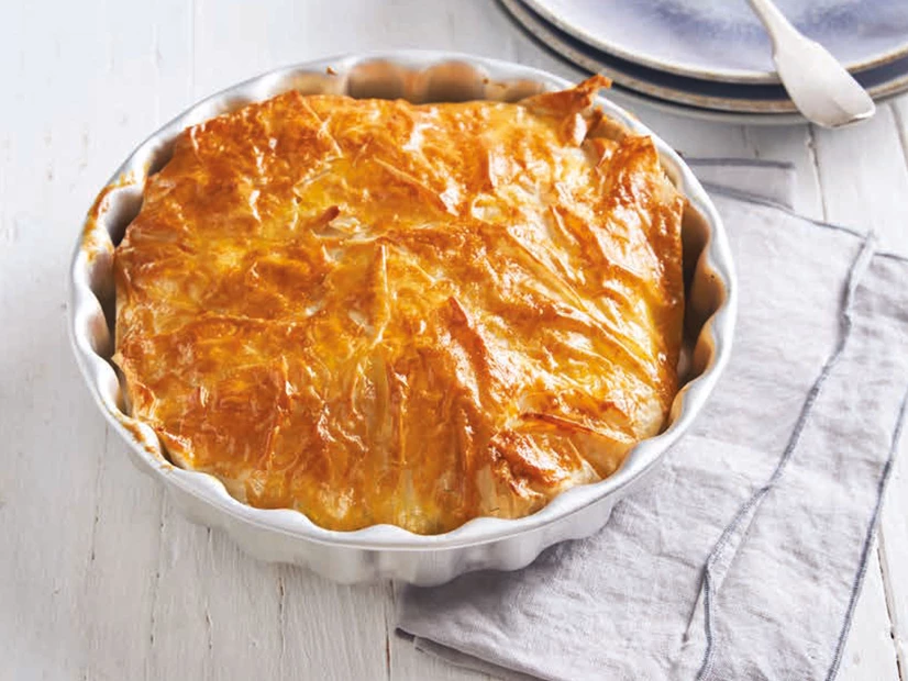 Pincele um dos lados de cada folha de massa filo com a manteiga e sobreponha-as. Coloque as folhas numa forma redonda forrada com papel vegetal, deixando as pontas caídas para fora.