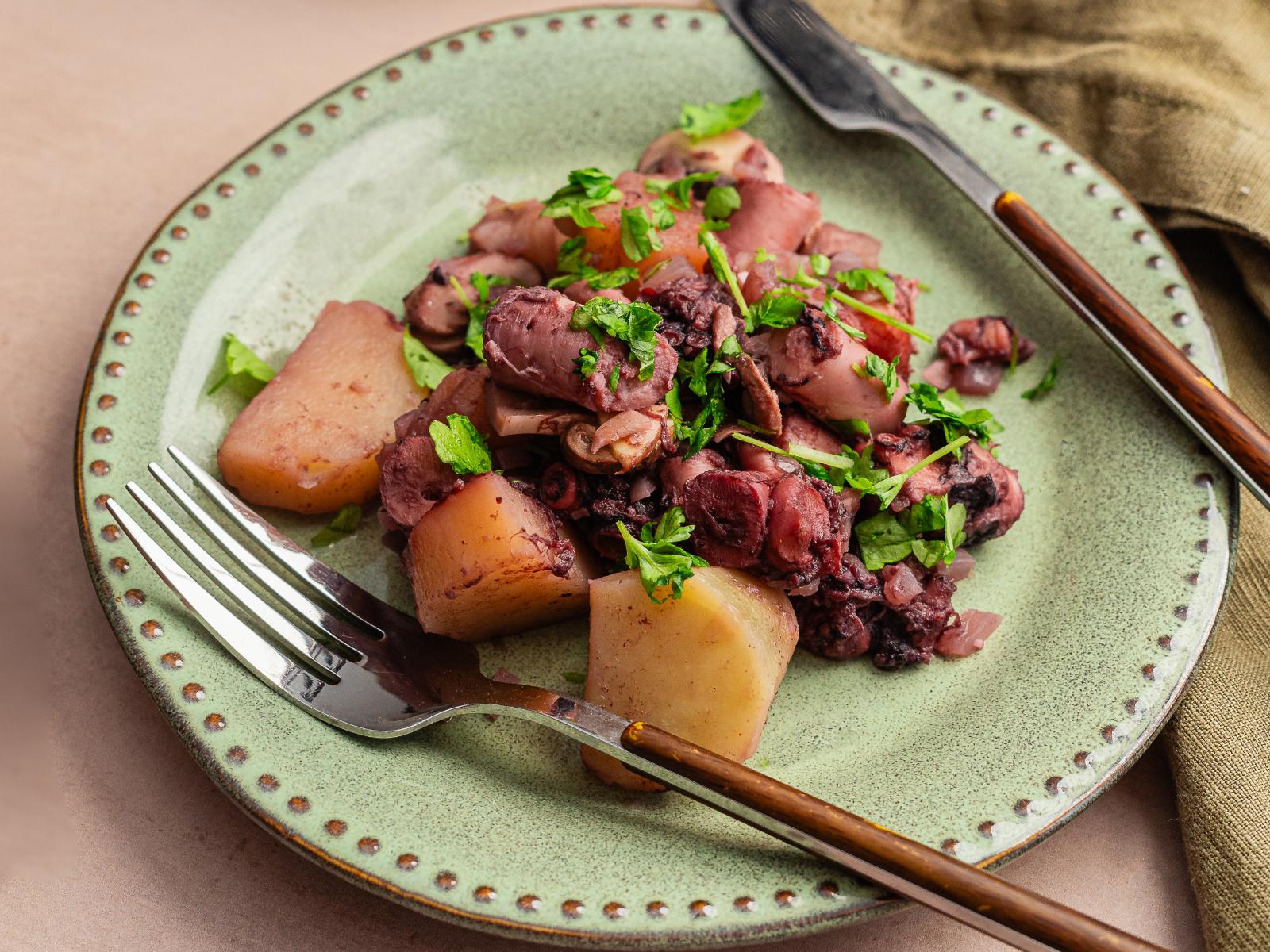 Retire o polvo do forno e sirva com as migas.
