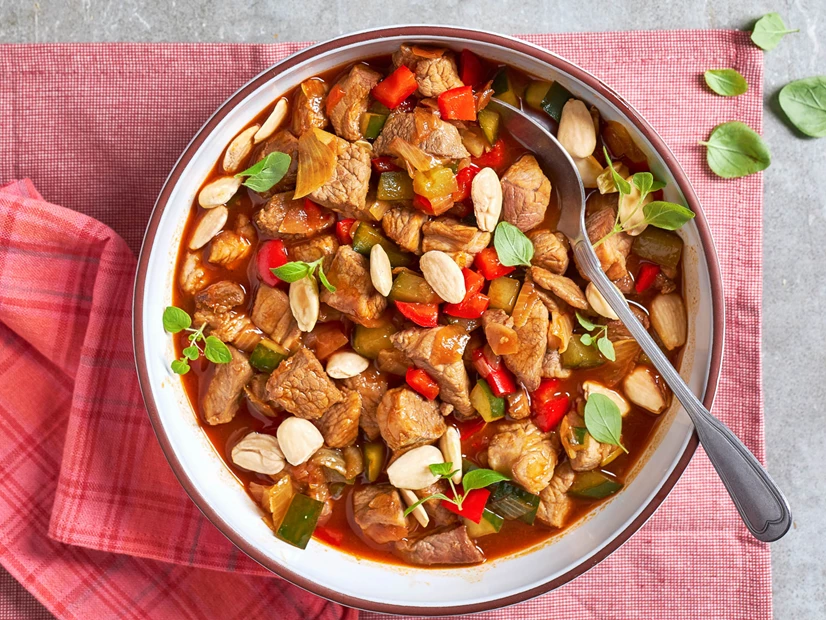 • Envolva bem, adicione o molho agridoce e deixe cozinhar por cerca de 15 minutos em lume brando.