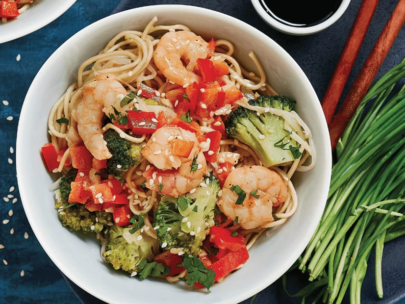 Adicione os noodles e o caldo de legumes e deixe ferver, misturando tudo muito bem. Assim que os noodles estiverem tenros, retire do lume e adicione os camarões.