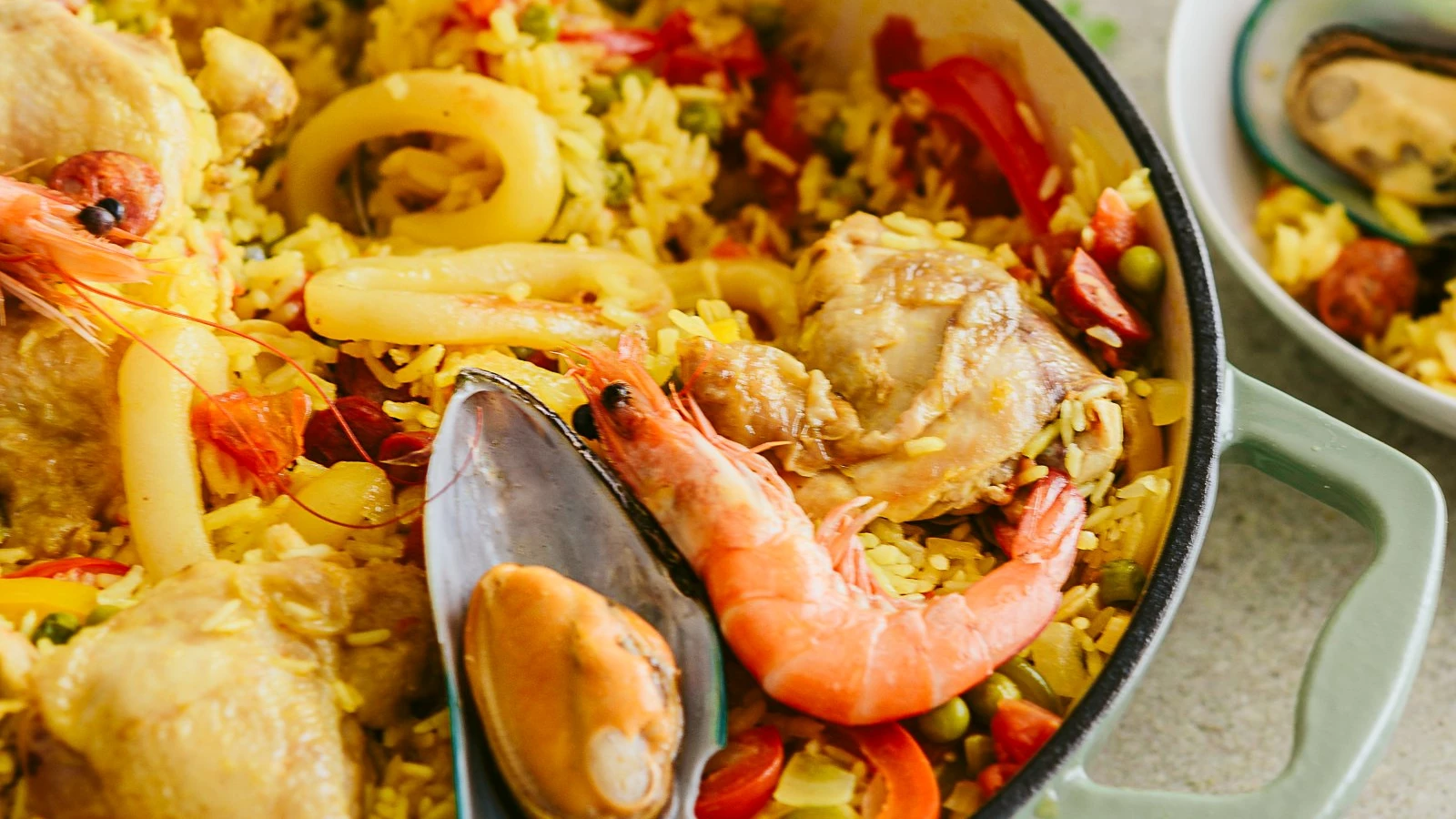 Tradicional da gastronomia espanhola, a paella é perfeita para um convívio entre amigos numa noite de verão ou para uma refeição em família após um dia de praia. É preparada à base de arroz, camarão, lulas e vegetais e é o toque do açafrão que confere ao prato o tão caraterístico tom amarelado.