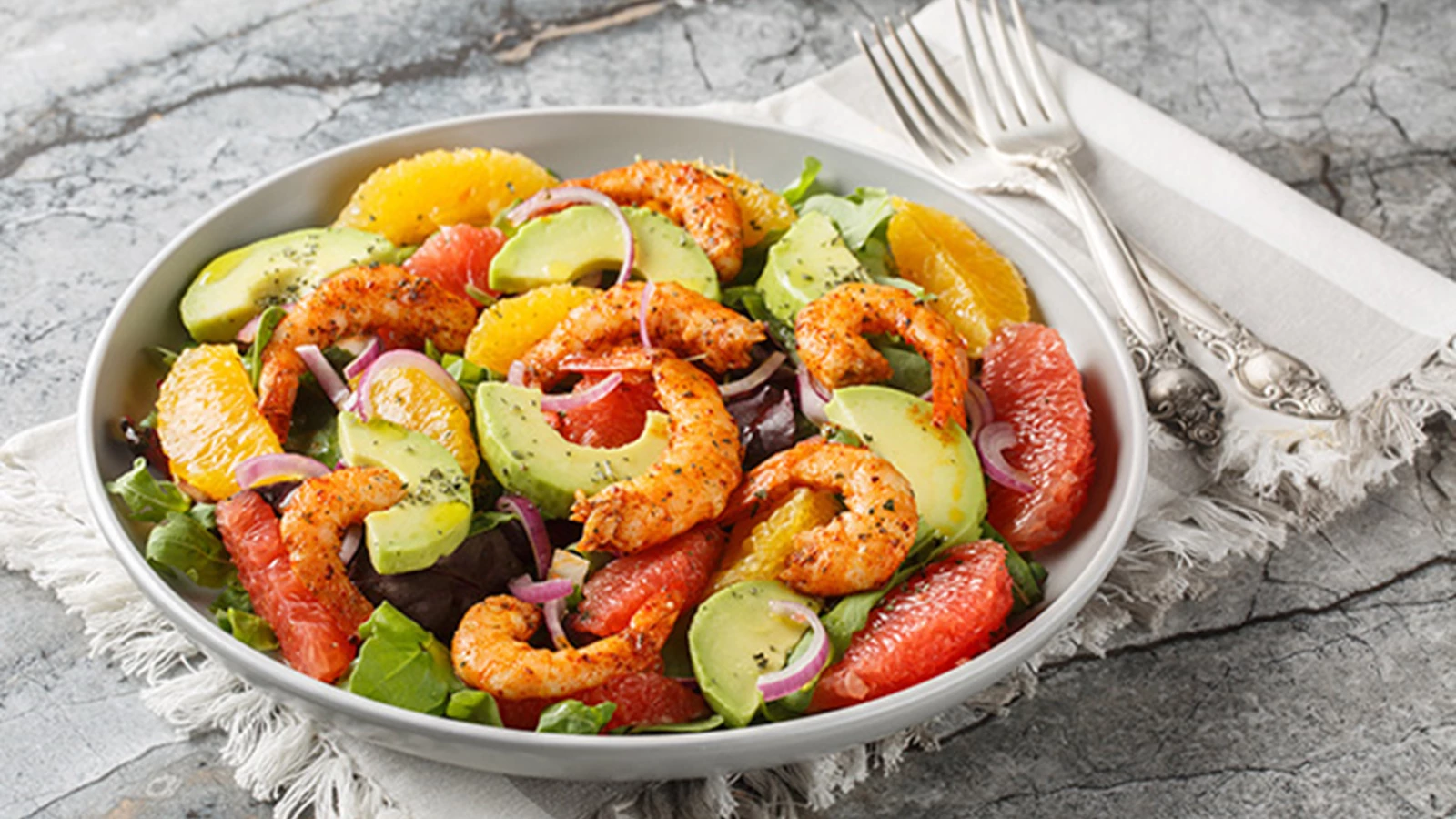 Para uma entrada fresca e leve, experimente esta salada de camarão com abacate. Misture camarões cozidos e temperados com fatias de abacate maduro, cebola roxa, manga, rúcula e hortelã. Regue com chutney de manga e lima para um toque cítrico. Esta salada é perfeita para os dias mais quentes do ano. Uma receita com assinatura da Joana Barrios.