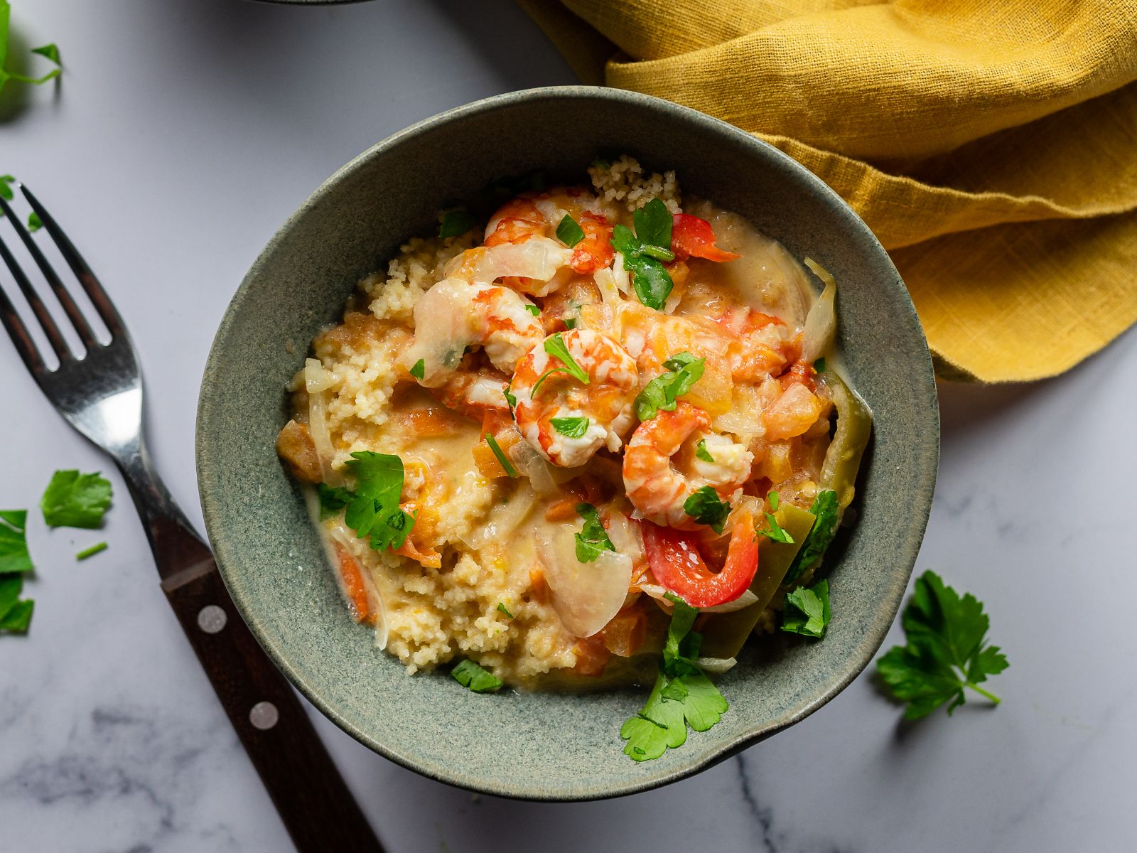 Comece por temperar o camarão já descongelado com sal, pimenta e raspa de lima. Salteie numa frigideira com um fio de azeite até dourar. Reserve o camarão.