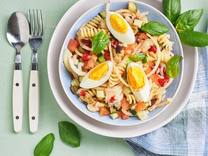 Envolva este preparado na massa, tempere com azeite e vinagre e decore com os ovos.