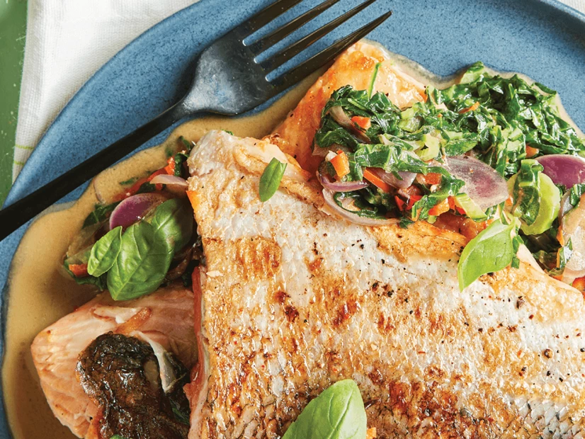 Por fim, adicione o pimento cortado em cubos e a couve ripada. Deixei cozinhar por cerca de 1 minuto e junte o salmão.