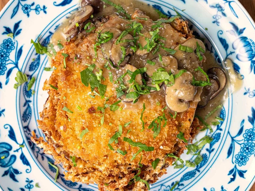 Incorpore os cogumelos e sirva por cima do schnitzel.