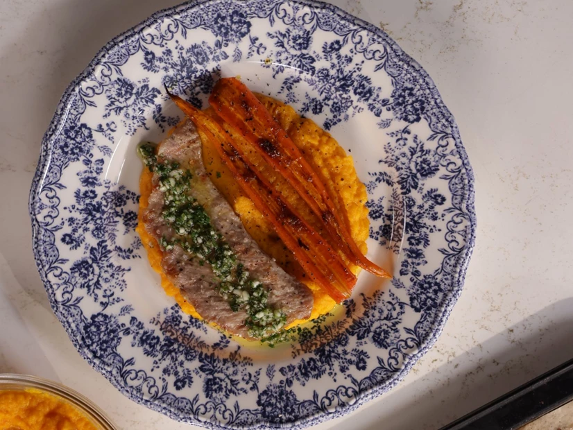 Sirva os secretos por cima de uma base de puré de cenoura e acompanhe com as cenouras caramelizadas reservadas. Tempere com pimenta e guarneça com o molho.